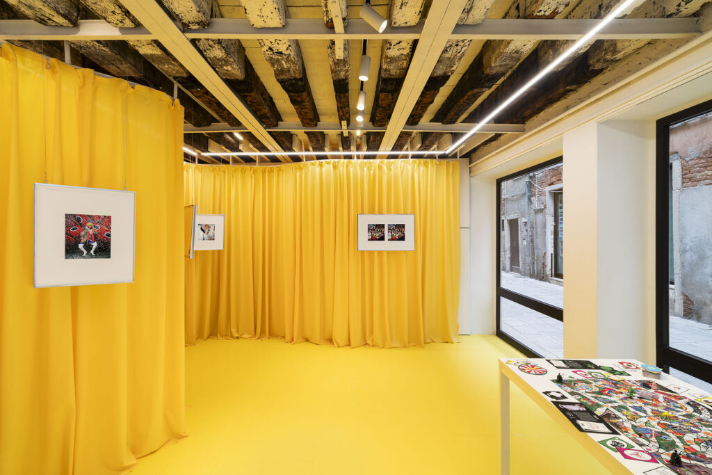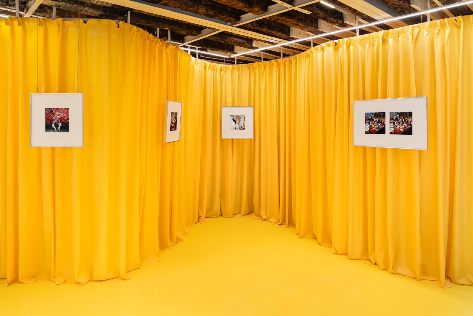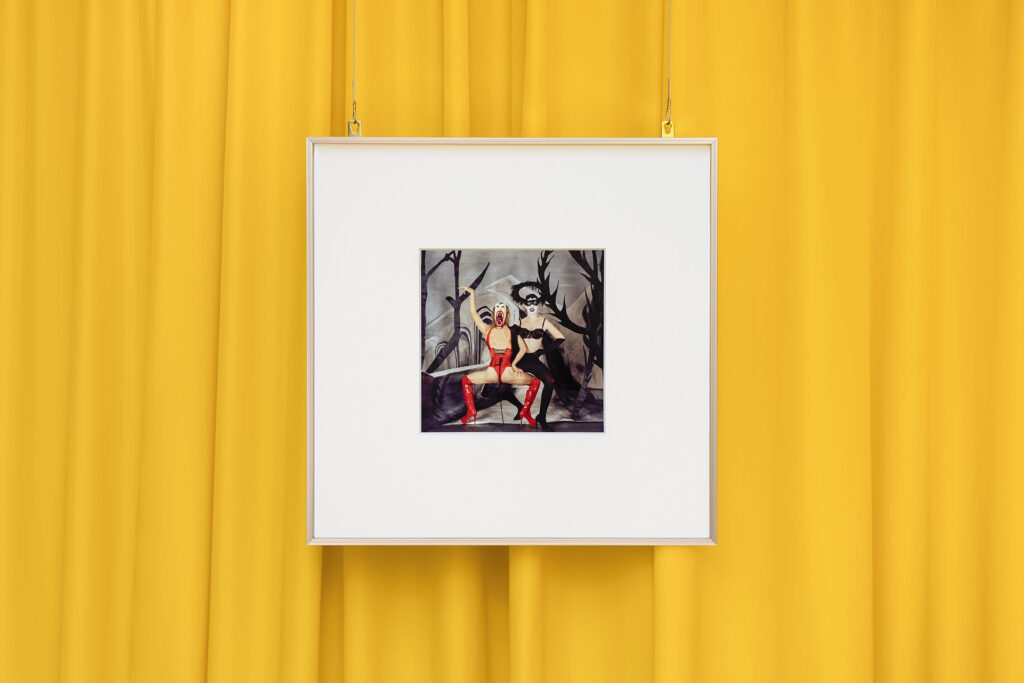 I colori sono saturi, i riferimenti si sovrappongono — moda, teatro, club culture, tradizione carnevalesca, immaginario editoriale — e ogni immagine sembra portare con sé una storia già iniziata altrove, che entra ed esce di scena di continuo. Una logica di fuoriuscita che non si esaurisce nello spazio espositivo, ma trova un’ulteriore estensione nella vetrina, intesa come corpo autonomo e insieme riflesso della mostra. Qui l’immagine sembra perdere definitivamente la bidimensionalità per ricomporsi in una presenza tridimensionale fatta di oggetti, maschere, coriandoli, elementi scenici. La scena si costruisce per accumulo e per equilibrio precario, trasformando l’armamentario del Carnevale in una composizione instabile, quasi ricorsiva. In questo senso, la vetrina dialoga apertamente con la fotografia del 2023 Trova le differenze: se lì due immagini quasi identiche sollecitano uno sguardo interrogativo, costretto a cercare lo scarto minimo, qui è lo spazio stesso a funzionare come dispositivo di confronto e variazione. La mostra si riflette in se stessa, si ripete e si deforma, come in una continua mise en abyme: il tabellone genera le immagini, le immagini diventano scenografia, la scenografia rimanda a un altro possibile gioco. Anche l’architettura ondulata dell’allestimento, con le sue pieghe e nicchie, agisce come una vetrina interna, un ulteriore luogo di apparizione. Tutto concorre a tenere lo sguardo in movimento, chiamato non a riconoscere, ma a distinguere.