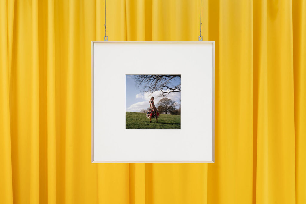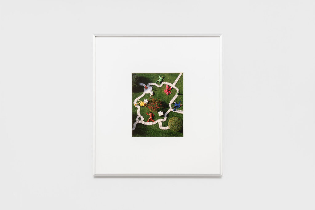 Al centro della galleria, Conciati per le feste nasce come gioco dell’oca fotografico, un’opera in edizione che mette in scena personaggi, ruoli, identità, più che regole o vincitori. Le pedine sono corpi, maschere, figure nominate una a una; il tabellone uno spazio narrativo che non conduce necessariamente a una fine, ma sempre a una nuova partenza. Squadernato come una partita già avviata e improvvisamente interrotta, il gioco si presenta in Stage Presence come un dispositivo in attesa: non un oggetto concluso, ma una situazione pronta a riattivarsi.