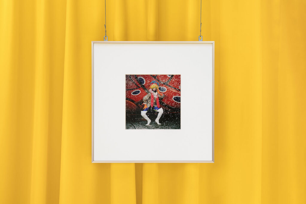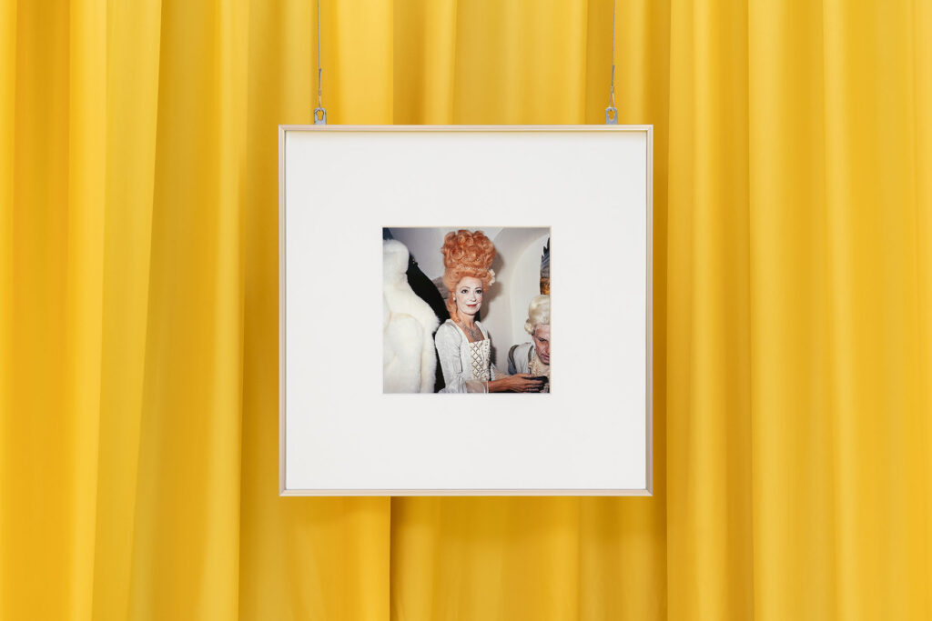 In Siamo coriandoli i corpi appaiono come frammenti in festa, figure che esistono solo nella relazione con gli altri, nella prossimità, nel contatto; in A che gioco stai giocando lo sguardo diventa più frontale, interrogativo, come se venisse richiesto allo spettatore di dichiarare la propria posizione, di scegliere un ruolo, di comprendere le differenze (non solo in senso didascalico). Drama Club mette in scena una teatralità più esplicita, fatta di gesti accentuati, posture studiate, una recitazione che non nasconde di essere tale, mentre Galassia apre lo spazio a una illustrazione più cosmica e artificiale, dove il costume e il makeup intendono favorire un’identità fluttuante, senza peso. In Trimalcione 2000 — con la sua connotata origine festiva e tipicamente veneziana — condensa in un’unica immagine eccesso, ritualità e messa in scena collettiva. Tutte queste fotografie, pur appartenendo a serie e momenti diversi, convivono come vignette di un grande fumetto senza ordine prestabilito, legate più da un’atmosfera che da una trama. In Self-portrait l’artista entra in palcoscenico, assumendo su di sé la logica del travestimento e dell’autorappresentazione, nell’atto risolutivo e irriverente di voltare le spalle, armato di spada, alla scena che ha appena creato, come se fosse sul punto di congedarsi con un melanconico sorriso, to say hello then wave goodbye alla fine dello spettacolo.